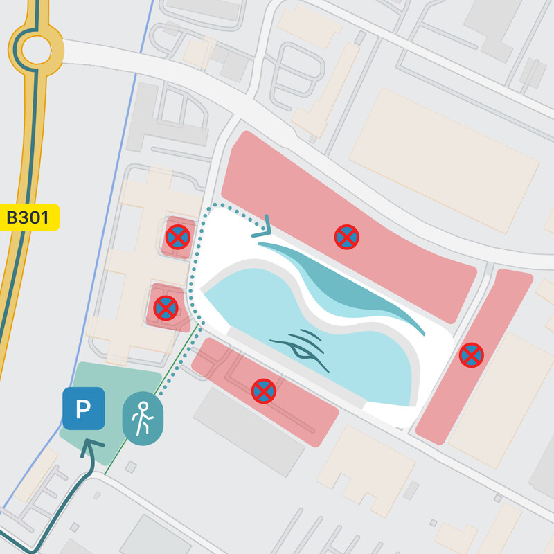 An unserem Parkplatz angekommen, folgst du einfach dem beschilderten Weg Richtung O2 SURFTOWN MUC. Halte dich am Ende des Wegs links, und so wirst du durch die Beschilderungen zu unserem Eingang geleitet, der sich auf der rechten Seite befindet. Bitte beachte, dass einige der umliegenden Parkplätze privat sind und nicht genutzt werden dürfen.